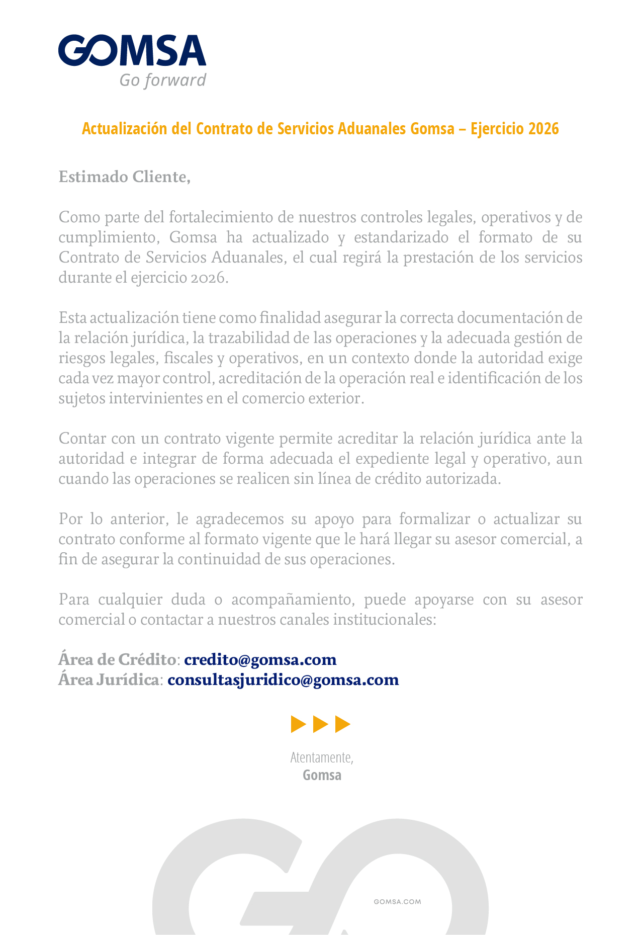 ACTUALIZACIÓN DEL CONTRATO DE SERVICIOS ADUANALES GOMSA – EJERCICIO 2026