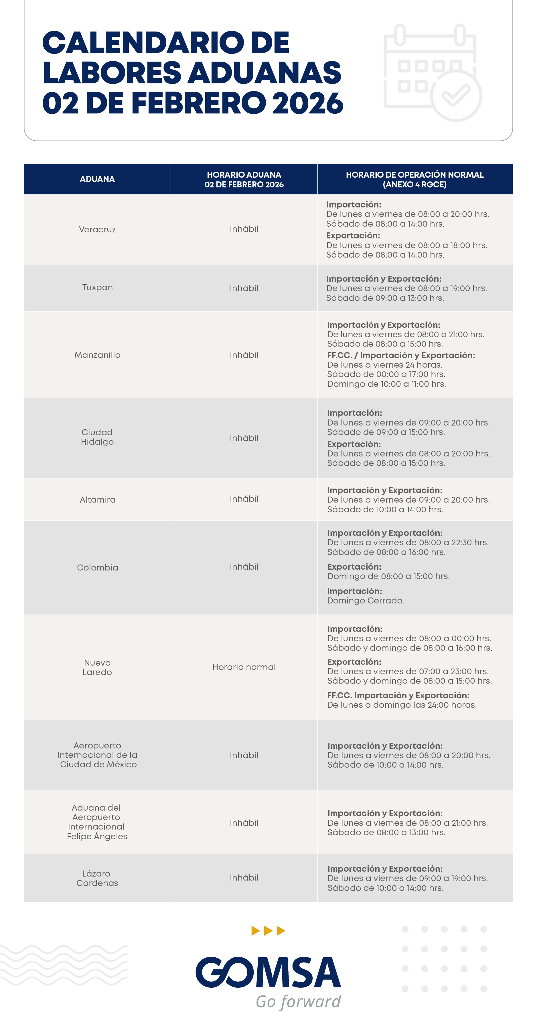CALENDARIO DE LABORES ADUANAS 02 DE FEBRERO DE 2026