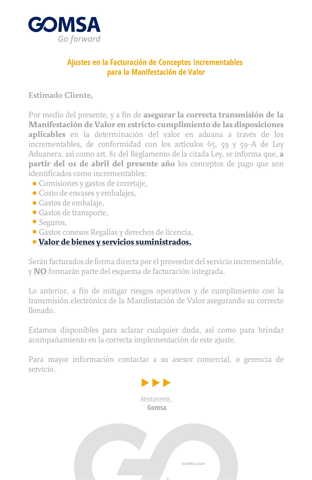 • AJUSTES EN LA FACTURACIÓN DE CONCEPTOS INCREMENTABLES PARA LA MANIFESTACIÓN DE VALOR