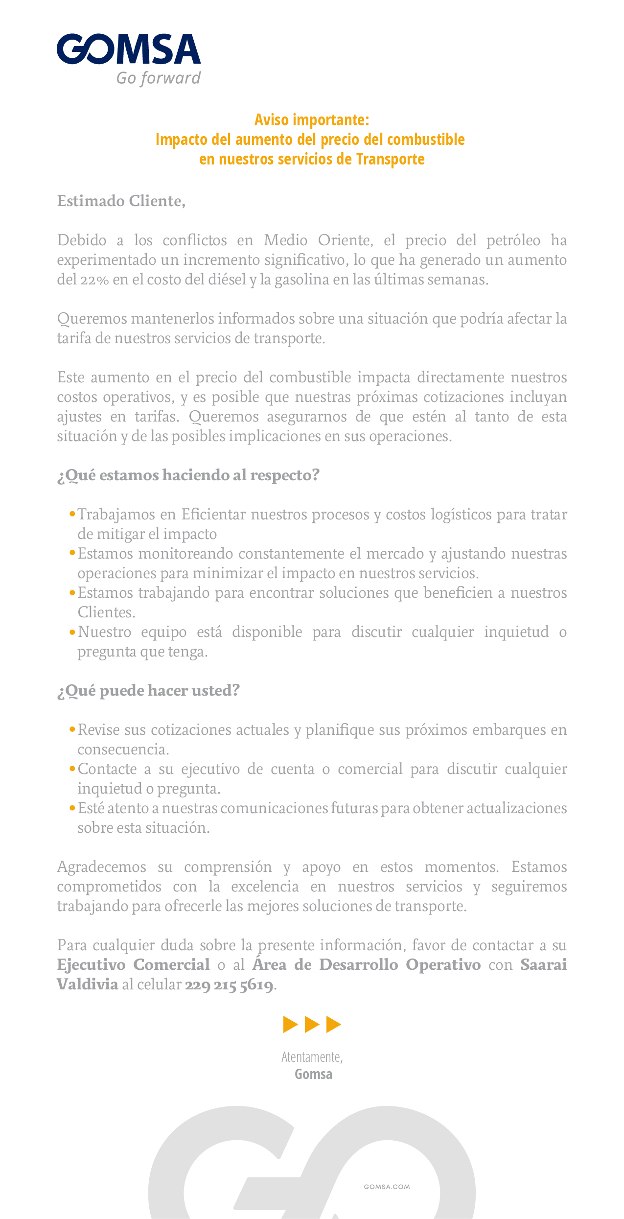 AVISO IMPORTANTE: IMPACTO DEL AUMENTO DEL PRECIO DEL COMBUSTIBLE