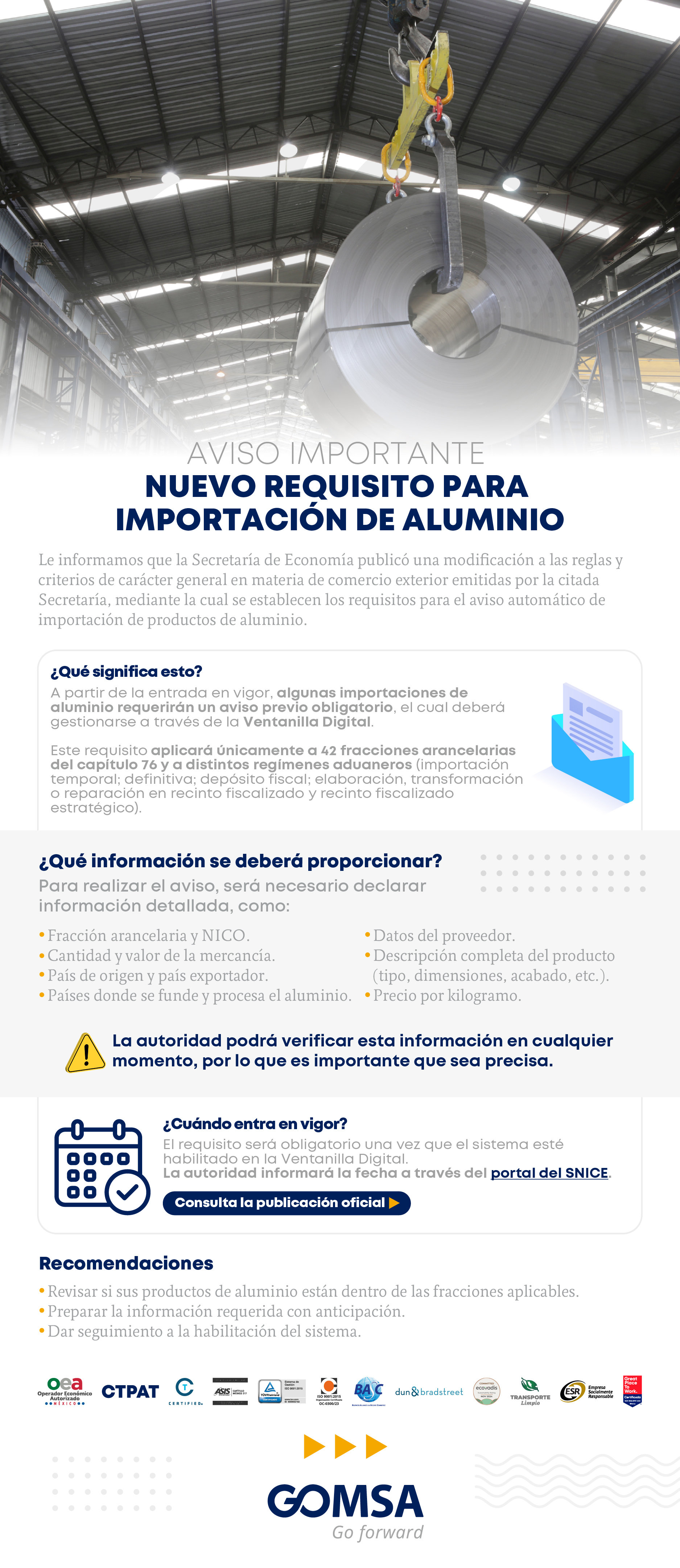• AVISO IMPORTANTE – NUEVO REQUISITO PARA IMPORTACIÓN DE ALUMINIO