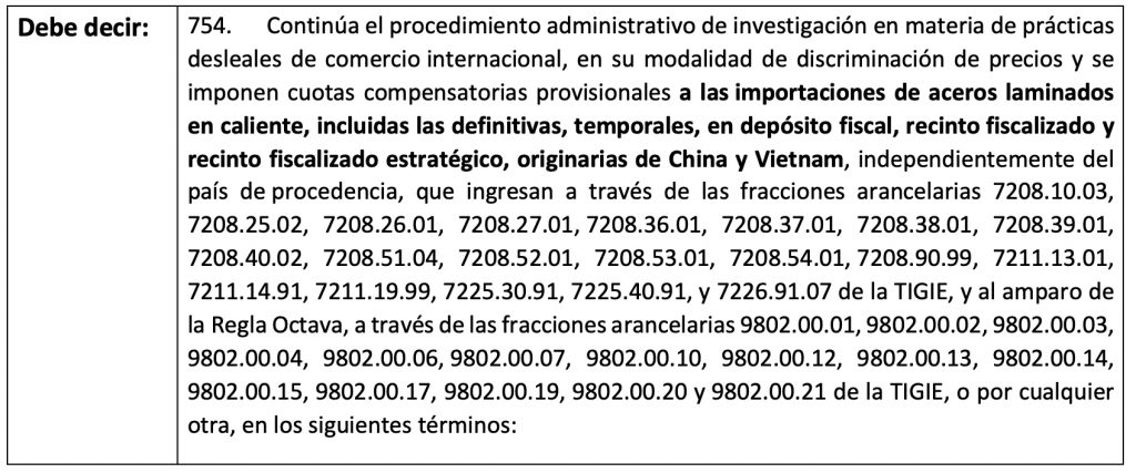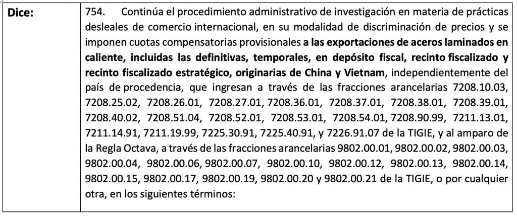 Por medio del presente, le informamos que en relación a lo mencionado en el boletín número JU-078-2026, la Secretaría de Economía publicó en el DOF la “Nota aclaratoria a la resolución preliminar del procedimiento administrativo de investigación antidumping sobre las importaciones de aceros laminados en caliente originarias de la República Popular China y la República Socialista de Vietnam, independientemente del país de procedencia, publicada en el Diario Oficial de la Federación el 23 de marzo de 2026.” de la cual se comparte lo siguiente: